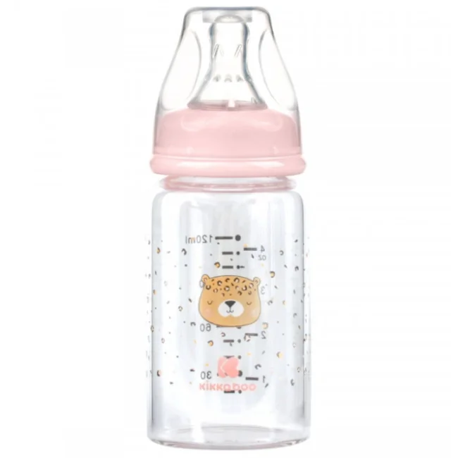 Dečija Kikka Boo staklena flašica Savanna 120ml Pink za hranjenje poseduje standardno grlo i pogodna je za mališane od rođenja.