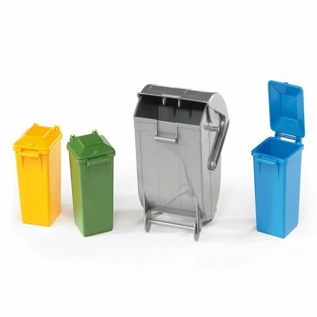 Ovaj Bruderov dečiji set kanti za djubre sadrži jedan veliki sivi kontejner i tri male kante u boji.