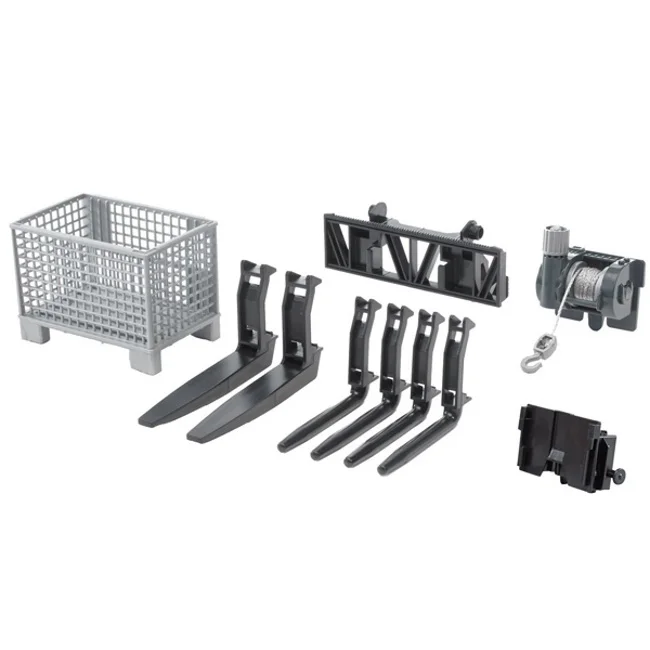 Bruder set dodataka za radne mašine se sastoji od kante za smeće, adaptera, kablovskog vitla, dve viljuške i dve vile za palete.