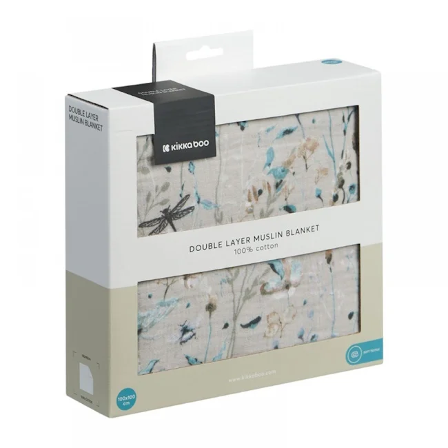Kikka Boo dvoslojno baby ćebence od muslina 100x100cm Dreamy Fields Grey je pogodno za vreme dojenja, posle kupanja, dok beba spava u kolicima.