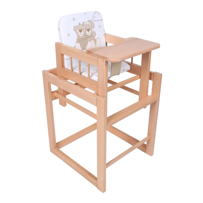 Ova drvena hranilica za bebu je komplet 2 u 1 - sto i stolica. Stolica je presvučena sunđerom i PVC folijom u različitim dečijim dezenima. Funkcionalan set koji je prilagođen za uzrast od 6 meseci do predškolskog uzrasta. U početku se koristi u položaju kao stolica za hranjenje, a kada se taj položaj preraste postolje se okreće u položaj stola. Komplet se može koristiti pojedinačno kao sto i stolica do uzrasta oko 6 godina.