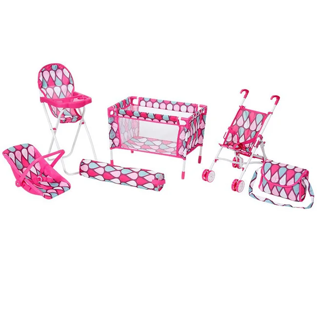 Set za devojčice sadrži: torbu, kolica, prenosivi krevetac, hranilicu i nosiljku.