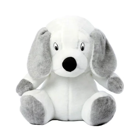 Neodoljivo mekana plišana kuca Bubi, bela sa sivim ušima i šapicama, visine 40 cm. Možda je baš ona budući najbolji drugar vašeg mališana.