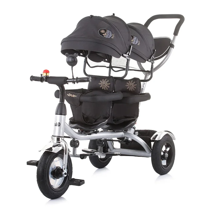 Tricikl za blizance ili dva deteta sličnog uzrasta Chipolino 2Play pruža neograničen broj mogućnosti za igru na otvorenom. Deca mogu samostalno da voze tricikl pomoću pedala ili mogu da odmaraju dok roditelj upravlja. Prednje sedište je rotaciono, te deca mogu biti okrenuta jedno prema drugom.